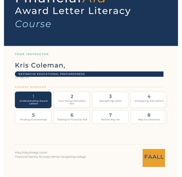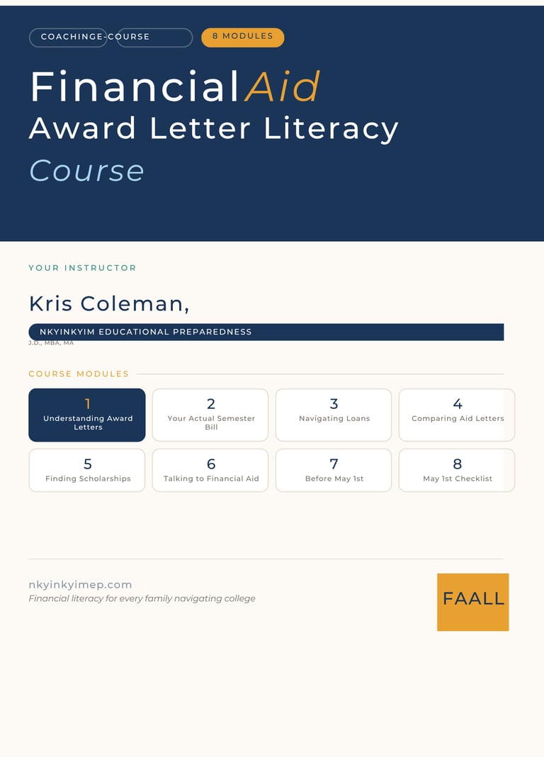 The Financial Aid Award Letter Literacy (FAALL) course gives families the tools to decode college award letters, calculate their true out-of-pocket costs, and compare schools side by side — before the May 1st deadline. Most families receive award letters with no guidance on what the numbers actually mean, leaving them to make one of the biggest financial decisions of their lives in the dark. FAALL changes that with 8 video modules, interactive worksheets, and three built-in tools including the Financial Aid Decoder, Scholarship Tracker, and Off-Bill Living Budget. Whether you are choosing between a PWI and an HBCU, a public and a private school, or trying to figure out how much debt your student will actually carry — this course gives you the clarity to choose confidently.